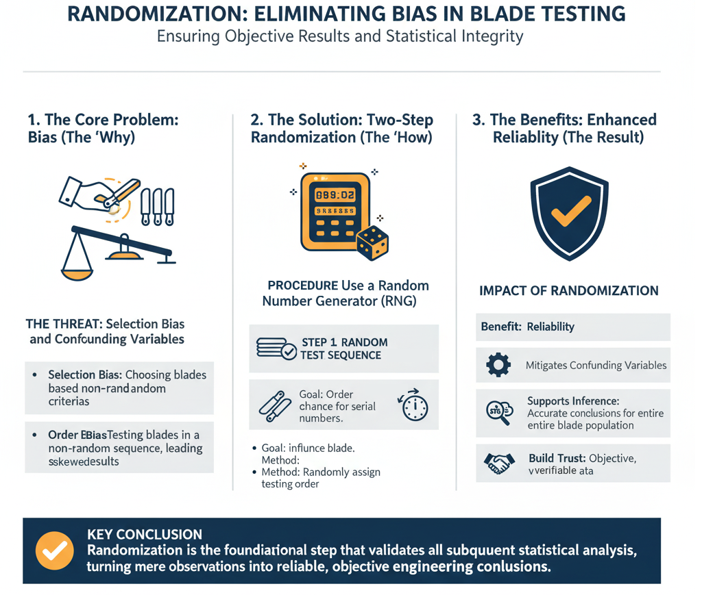 By mitigating the impact of confounding variables and distributing external influences evenly across the test samples, randomization enhances the reliability of the conclusions drawn from the data. It also adds statistical rigor to the testing process, allowing for accurate inferences about the blade's performance across a general population of similar products.
